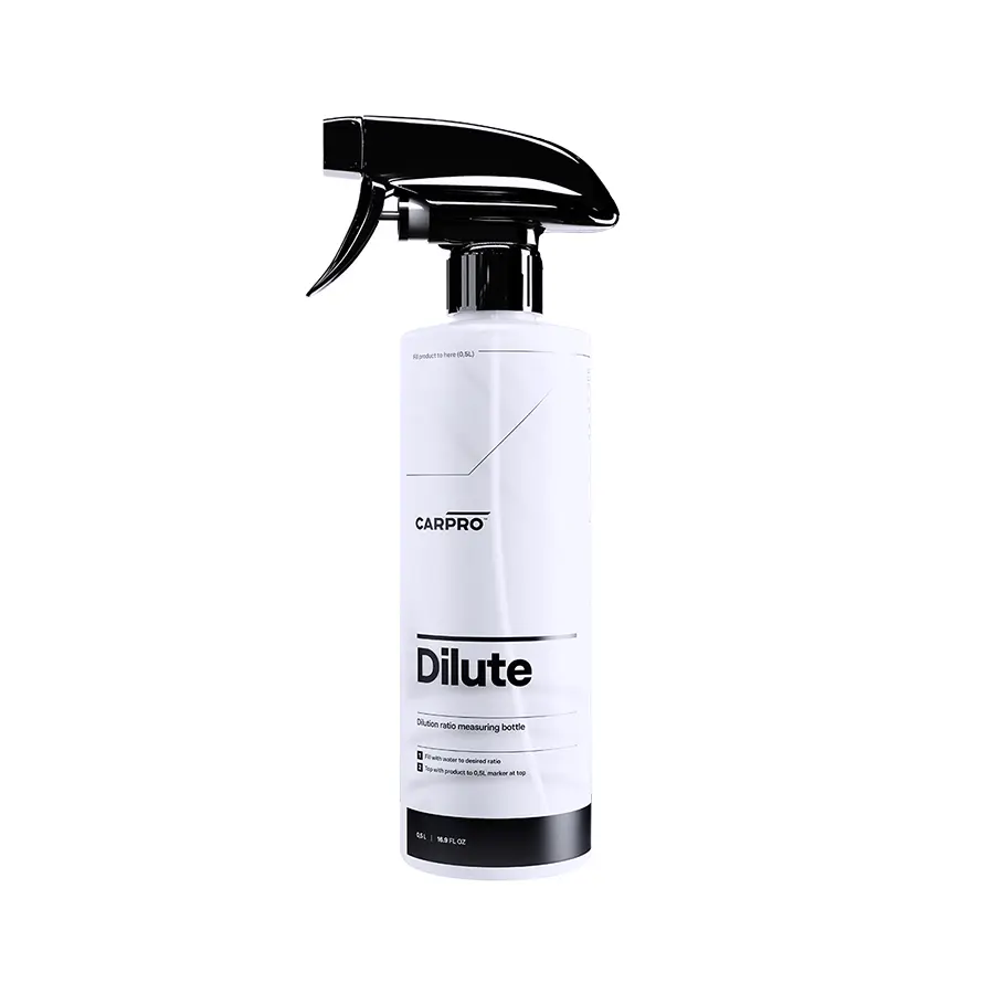 The Dilute bottle contains the required dilutions pre-printed for all your CARPRO products. Simply fill with water to the desired dilution ratio, then top up to the fill line with product and give it a good shake! Ratios vary from 1:1 to 1:30 with space to write the product name and dilution ratio on the label! Every Dilute comes with a free CARPRO chemical resistant spray head.